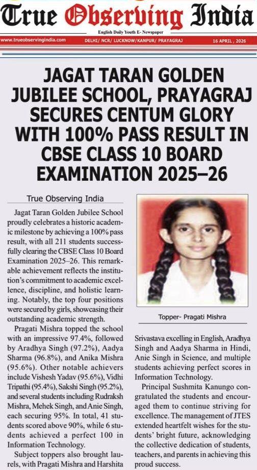 JAGAT TARAN GOLDEN JUBILEE SCHOOL, PRAYAGRAJ SECURES CENTUM GLORY WITH 100 % PASS RESULT IN CBSE CLASS 10 BOARD EXAMINATION 2025 - 2026